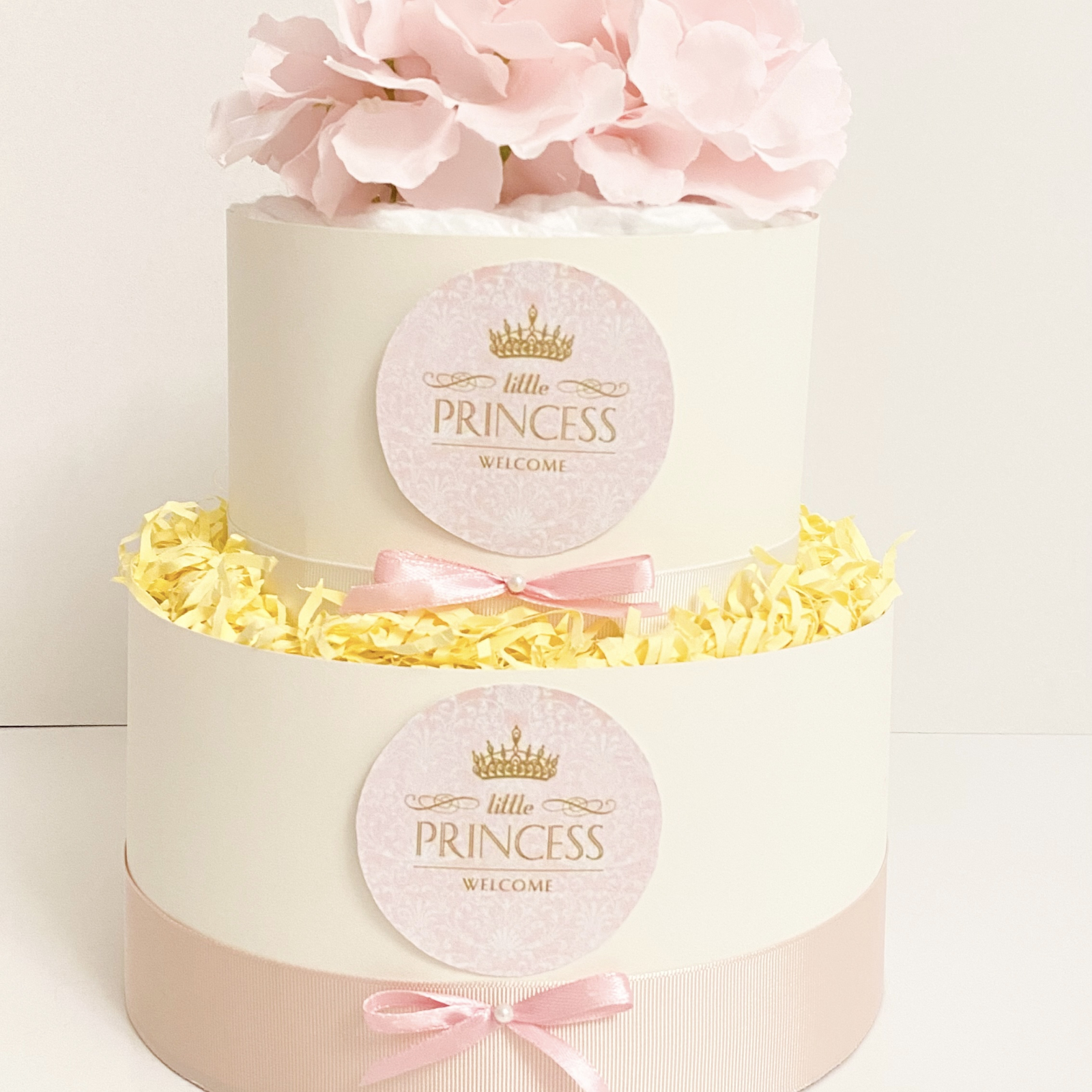 Tort Mediu de Scutece Pampers pe Două Nivele – Cadou Regal pentru Fetițe