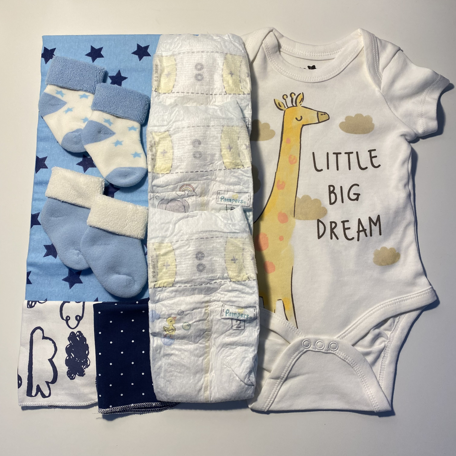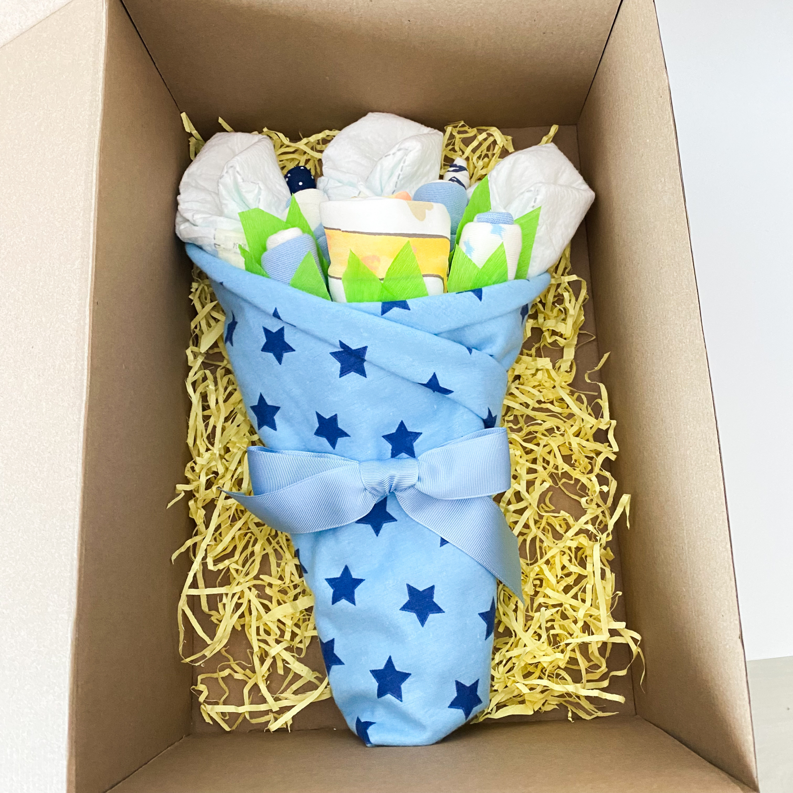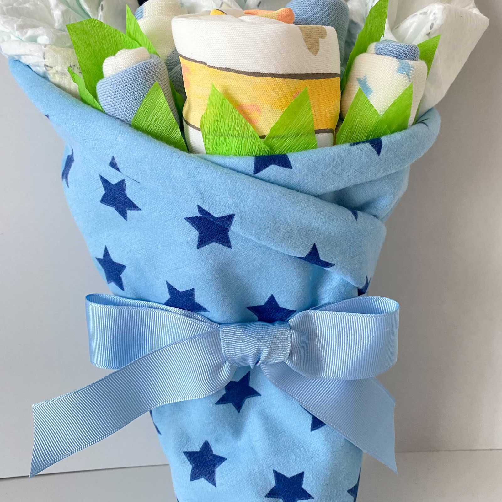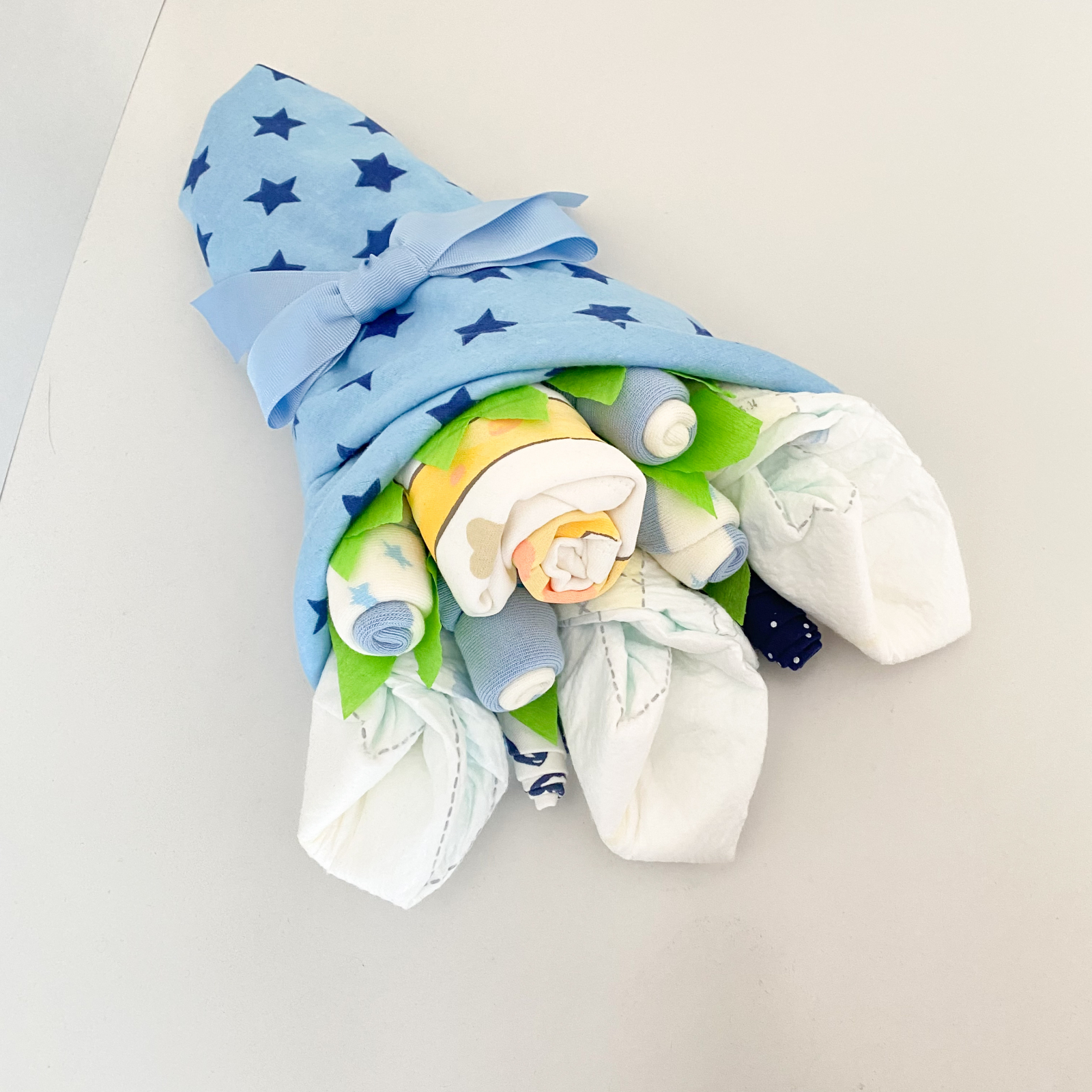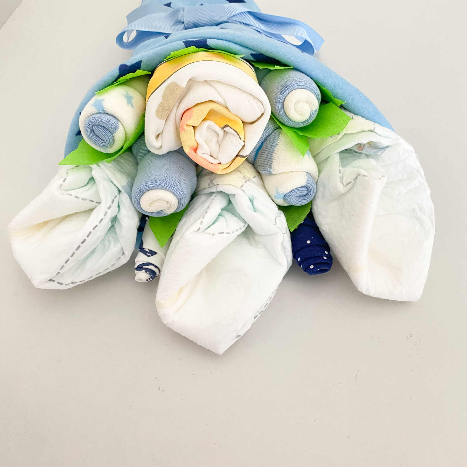 Perfect ca buchet din hăinuțe de bebe, cadou mama și bebe, cadou pentru baby shower, cadou proaspătă mămică, cadou corporate pentru 8 martie, sau cadou de botez bebeluș băiețel.